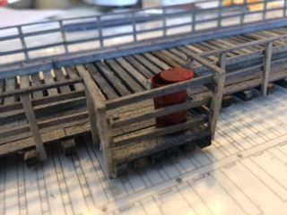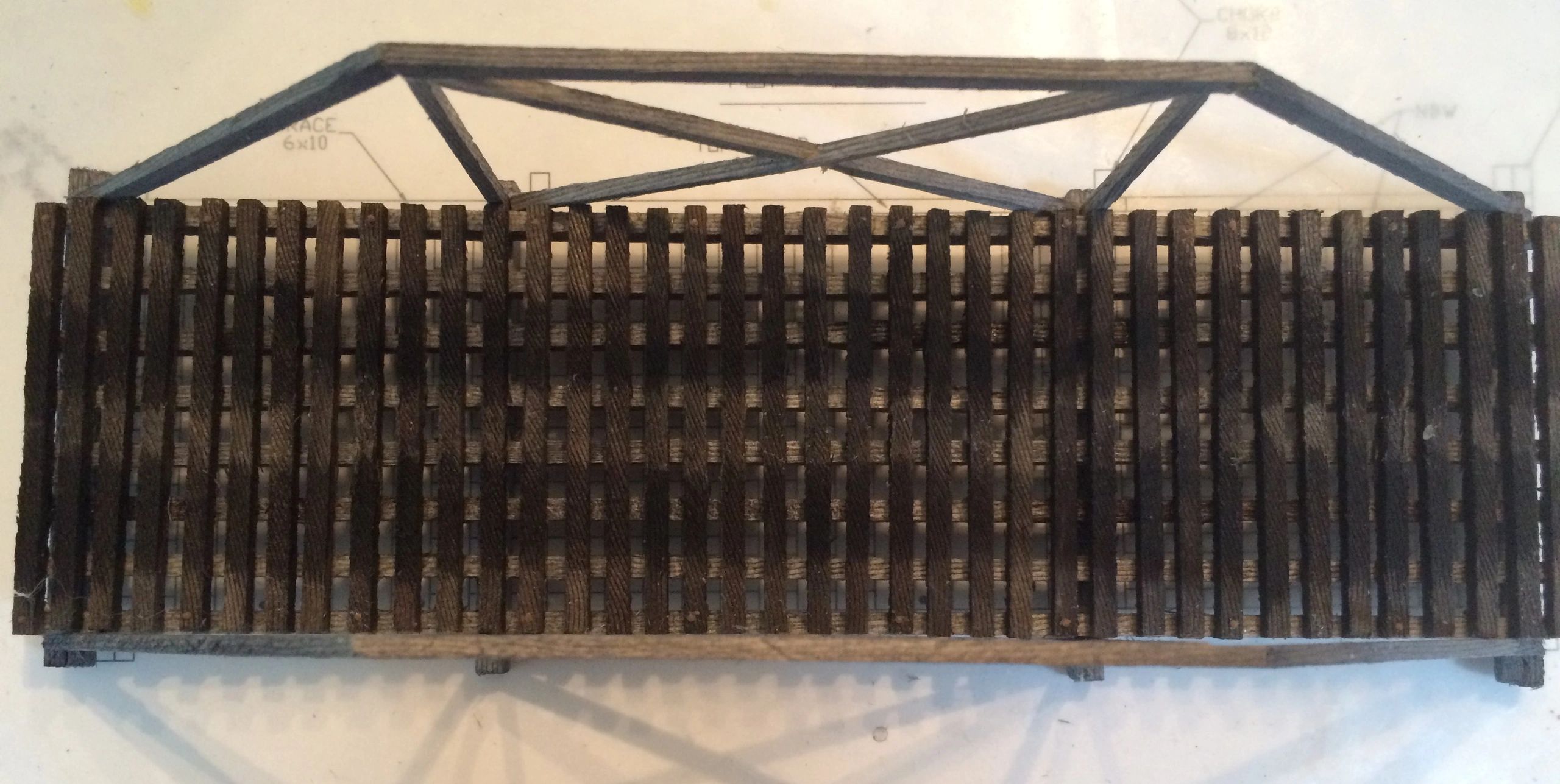 Creosote Black: One of our most popular colours used where you would like to add ‘grime’, ‘soot’, shadows or an ‘oily, greasy’ look to your project. For example, along the Tie structure where the rail is located, under the eaves of a roof or the top of a through bridge where the soot from the steam engine would collect. We use it to colour our bridge Ties in combination with Light Gray and Tie Brown. It can also be used as a ‘wash’ over NBW castings – it highlights the bolt and washer. It works well on plastic structures – when used as a ‘wash’ and applied on a shingled roof held upside down, each shingle will be highlighted. When dry brushed on rail cars, rivets will be hi-lighted and you can achieve a very effective ‘well used’ weathered car. The possibilities are endless! In this photo of our Queen Post Bridge, the Ties were stained with a variety of colours – Driftwood, Cordovan Brown and Creosote Black. I then ‘dry brushed’ Creosote Black on the areas where there might be dirt, grime and grease. I followed up with a ‘wash’ of the Creosote Black. In the Howe Deck photo, you can see the darkened areas on the Ties made with our Creosote Black. The fire barrel was a bright red plastic material – I use the Creosote Black to ‘wash’ it. the rivets and barrel rings were immediately highlighted.